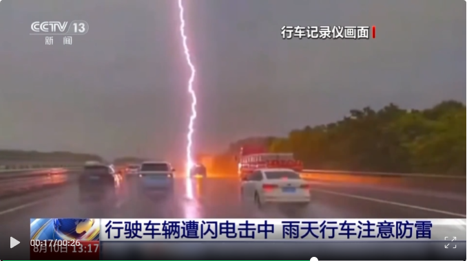 进入8月,全国多地强对流天气频发,广西、浙江等地相继出现行驶车辆遭雷击事件。8月5日,广西北海铁山服务区内,一辆小车在雨中缓慢行驶时被闪电击中,现场火光闪现,所幸人员无恙;8月2日,沪昆高速浙江境内,一辆轿车同样遭雷击,驾驶员冷静处置,安全脱险。